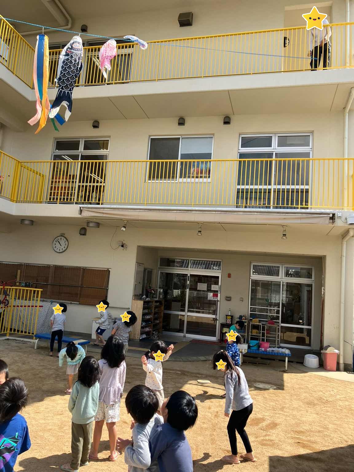 入園・進級式を終え、入園したことや一つ大きくなったことを喜び合いました。特に一番大きいクラスになった5歳児は、期待を胸に膨らませ張り切っています。そんな中、給食後、園庭に大きなこいのぼりを出しました。みんなで空を見上げて「わぁ泳いでる~!!」と大喜びし、ほっこりした時間となりました。